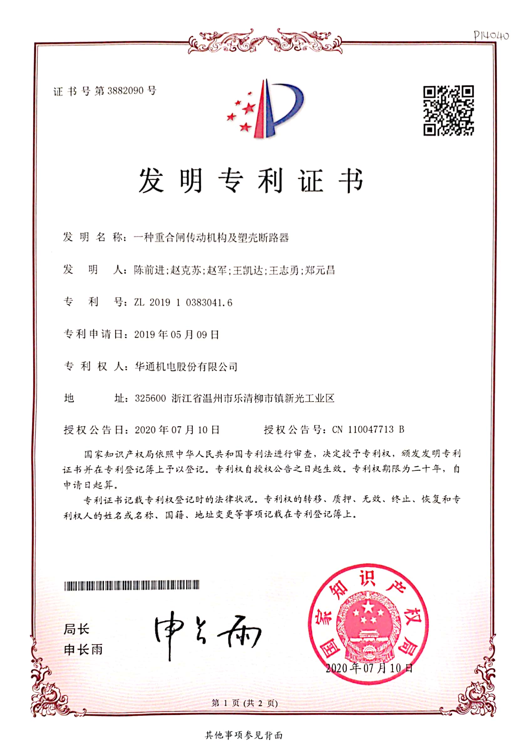發明專利:一種重合閘傳動機構及塑殼斷路器