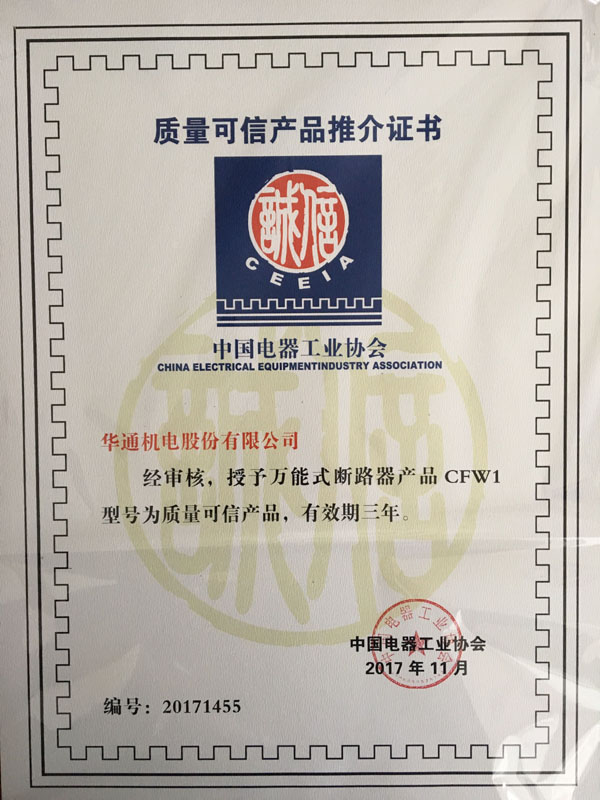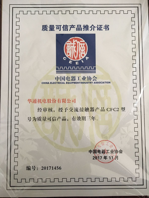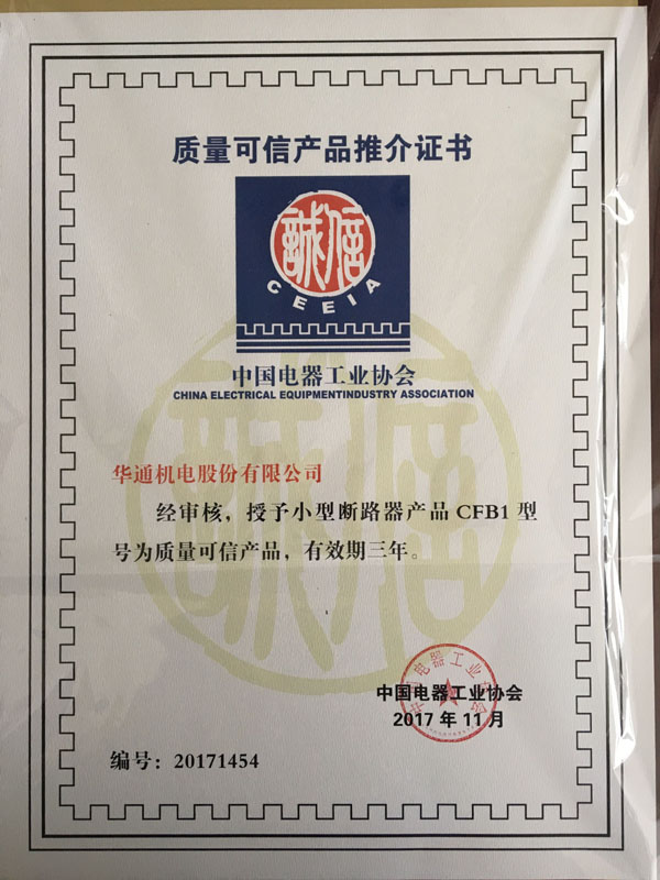 日前,由中國電器工業協會通用低壓電器分會組織對低壓電器“質量可信產品”進行復審,華通機電股份CFW1系列萬能式斷路器、CFB1系列小型斷路器、CFC2系列交流接觸器等三大系列產品復審通過,并分別獲得質量可信產品推介證書。