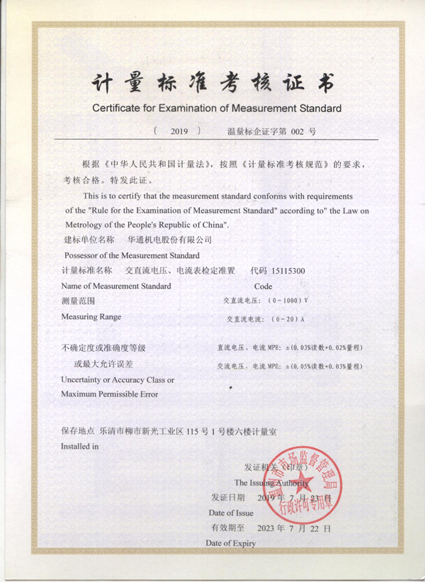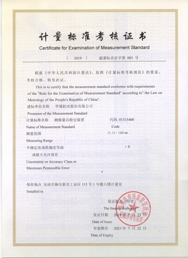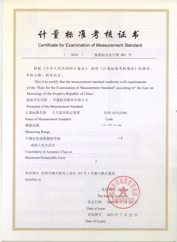 近日,溫州市市場監督管理局專家組一行對華通機電股份新建的測微量值檢定裝置、交直流電壓檢定裝置、卡尺量具檢定裝置等3項計量標準進行了考核評審,順利通過,并頒發了相應的《計量標準考核證書》。