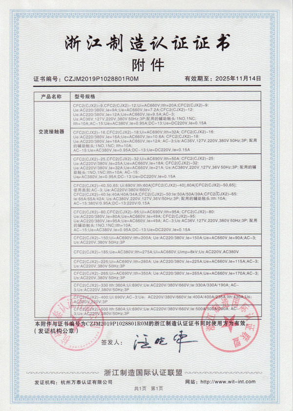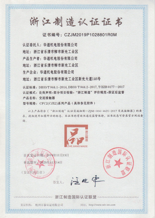 近日,華通機電股份CFC2(CJX2)系列交流接觸器喜獲“浙江制造認證證書”,這是繼DZ47-63小型斷路器獲首張浙江制造“品字標”公共品牌標識使用授權證書后,又一系列產品獲得殊榮。