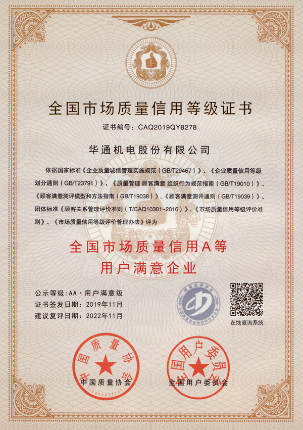 此項殊榮是經市場用戶評價、推進機構推薦、第三方信用評價機構評價和專家評審等,一致評價,華通機電股份注重市場質量誠信體系建設,注重用戶體驗,并在產品質量品牌鑄就、用戶服務質量提升上為抓手,不斷創新管理機制和舉措,很好的履行了 “專業制造,專心服務”的企業核心理念,得到市場及用戶的充分肯定,產生了良好的引領作用。并最終認定為全國用戶滿意企業,市場質量信用等級為AA級。